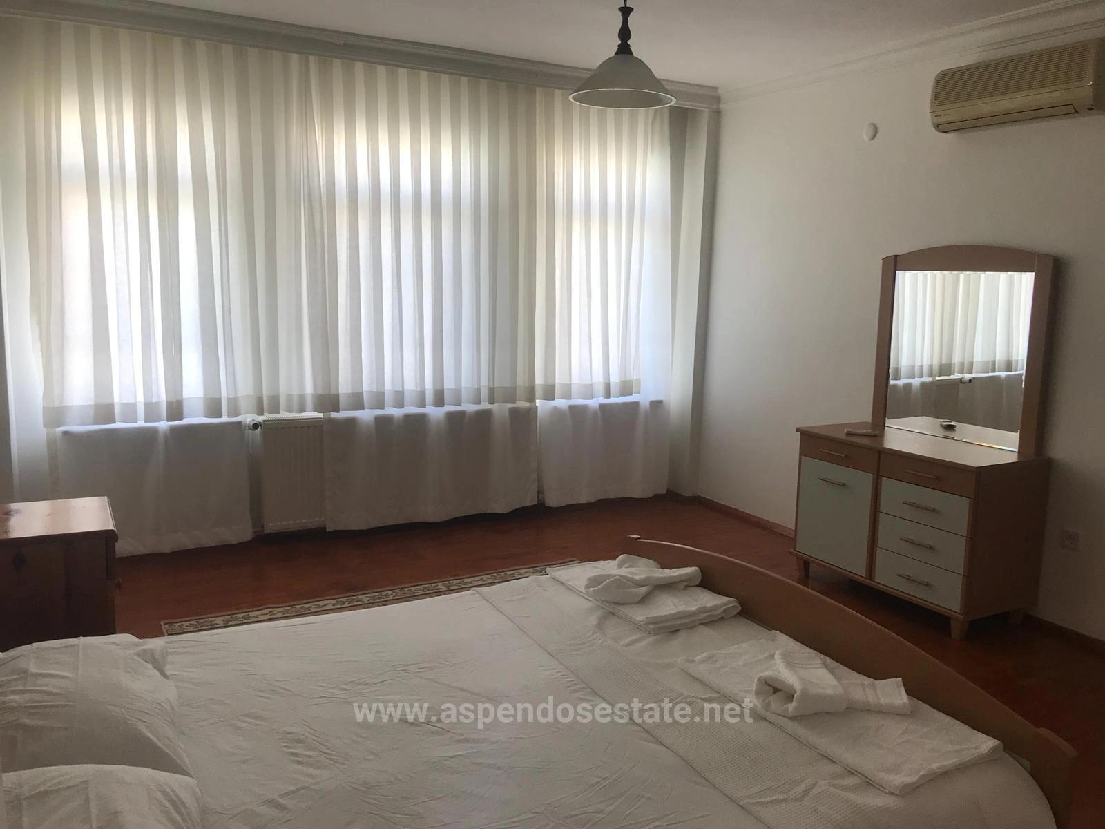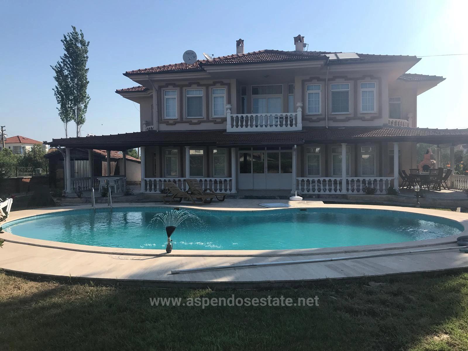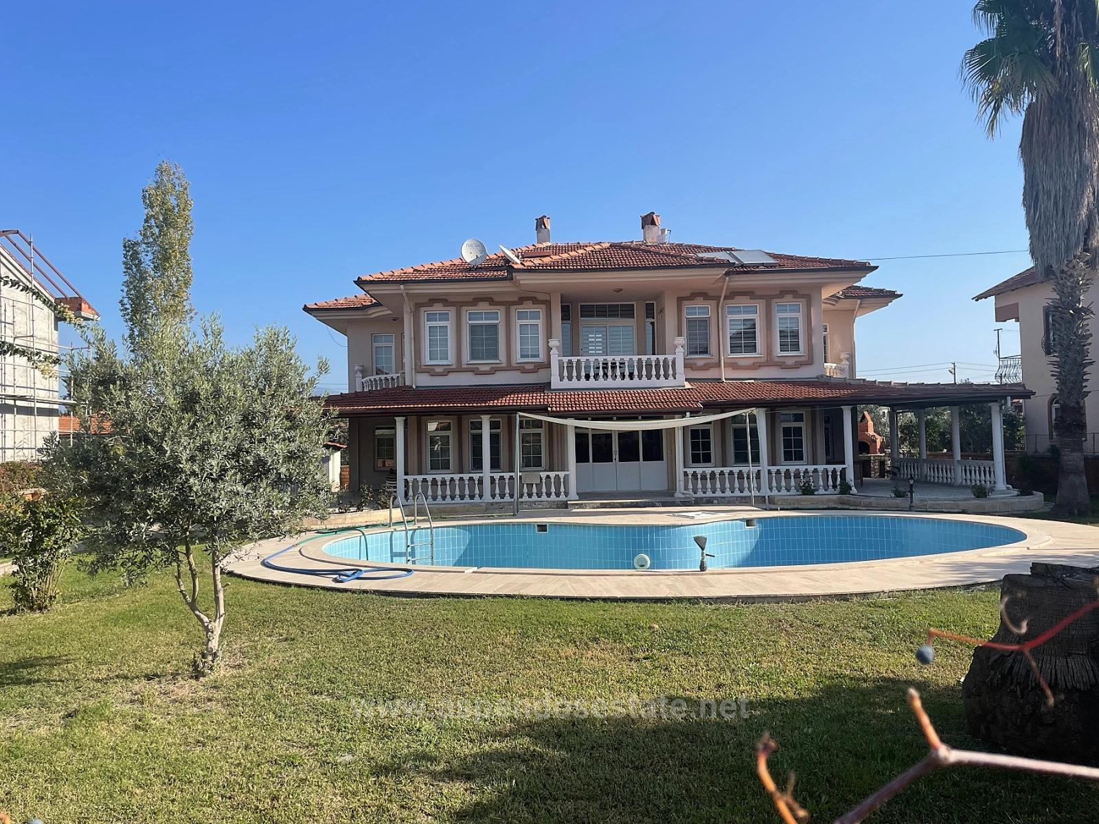 A villa with 4 bedrooms, a large open-plan living room, a separate kitchen, and 3 bathrooms, totaling 250m2 of indoor living space, is for sale in Dalyan on a 1000m2 plot. Each room has air conditioning. Heating is provided by a combi boiler. There is a fireplace and an outdoor swimming pool. The villa, which has a large garden, is within walking distance of shopping markets and the local market. It is 10 km from Iztuzu Beach and 25 km from the airport. It is within walking distance of the center. The villa requires some renovation. Price: 425,000 GBP