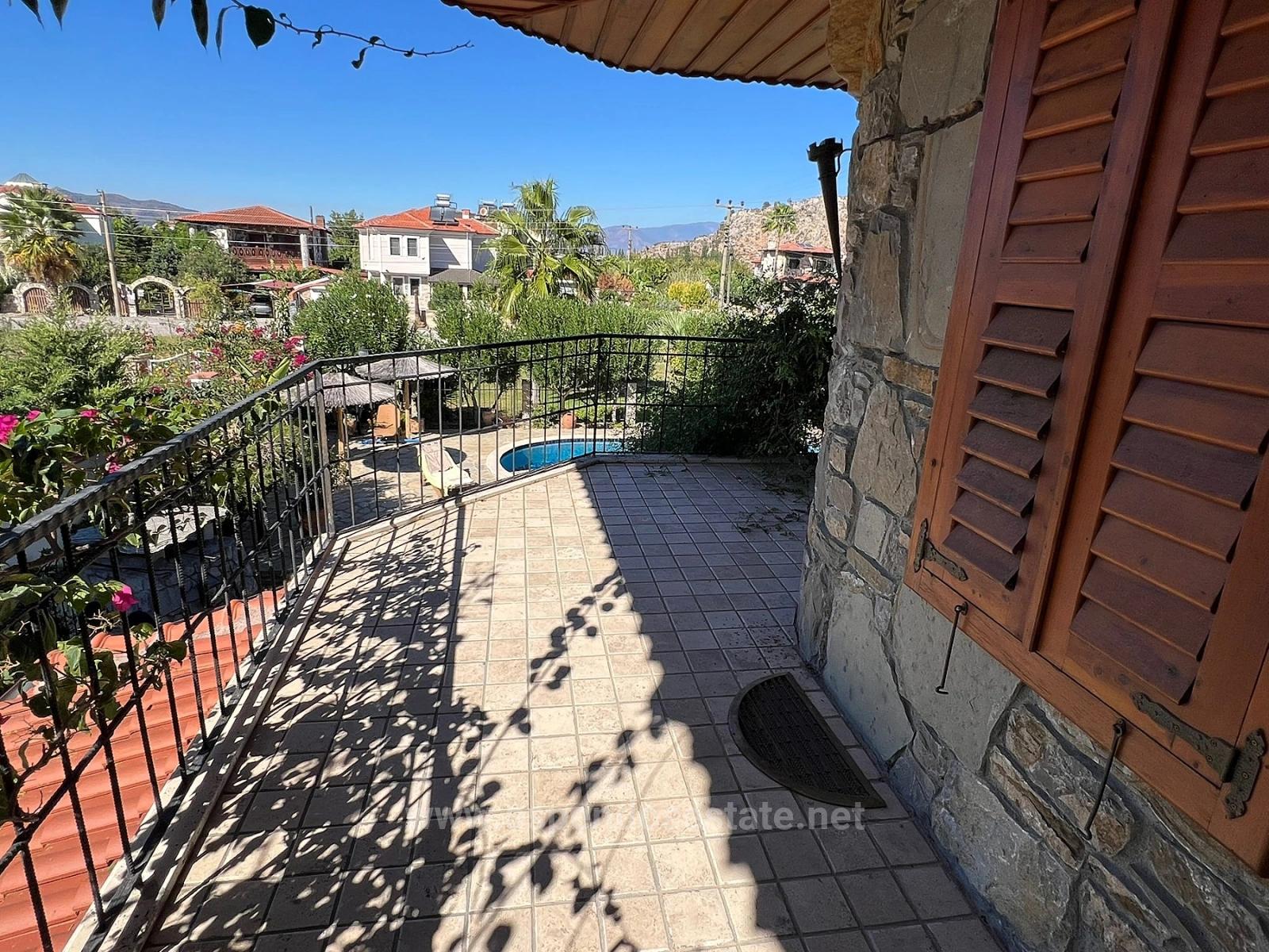 Отдельно стоящая каменная вилла продается на угловом участке площадью 580 м2 в районе Гюльпинар города Дальян. Из окон открывается беспрепятственный вид на зеленую зону. В главном здании расположены 4 спальни, большая гостиная с открытой кухней, 3 ванные комнаты, 3 балкона и большая терраса. В каждой комнате установлен кондиционер. Вилла полностью меблирована. Вилла полностью построена из натурального камня с преимущественно деревянной отделкой. Визуально она очень стильная и соответствует стилю региона. На территории есть открытый бассейн площадью 45 м2 с системой соленой воды. Также имеется отдельная ванная комната (1+0) и около 50 м2 жилой площади. Кроме того, есть зона для хранения бассейна и кладовая для материалов. Вилла недавно отремонтирована и не требует дополнительных вложений. Она находится в пешей доступности от торговых центров, в 10 км от пляжа Истузу и в 25 км от аэропорта. Из виллы открывается вид на природу и лес. Цена: 500 000 GBP
