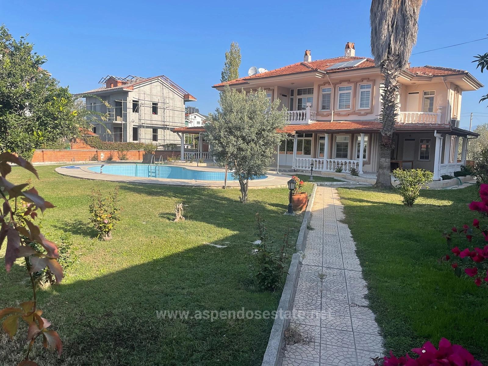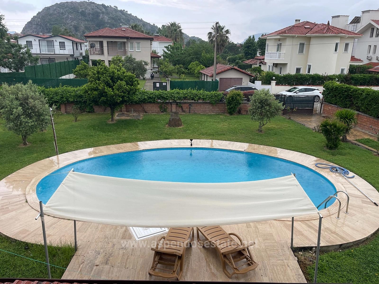 Dalyan'da 1000m2 arsa içerisinde 4 yatak odalı, 1 geniş açık salon, 1 bağımsız mutfak, 3 banyolu toplamda 250m2 kapalı kullanım alanına sahip olan villa satılıktır. Her odada klima mevcuttur. Isınma sistemi kombi kaloriferdir. Şöminesi vardır. Açık yüzme havuzludur. Geniş bahçeli olan villanın konumu alışveriş marketlerine ve semt pazarına yürüme mesafesindedir. İztuzu Plajı'na 10 km, havaalanına 25 km mesafesi vardır. Merkeze yürüme mesafesindedir. Villanın kısmen tadilat yapılması gerekmektedir. Fiyatı: 425.000 GBP
